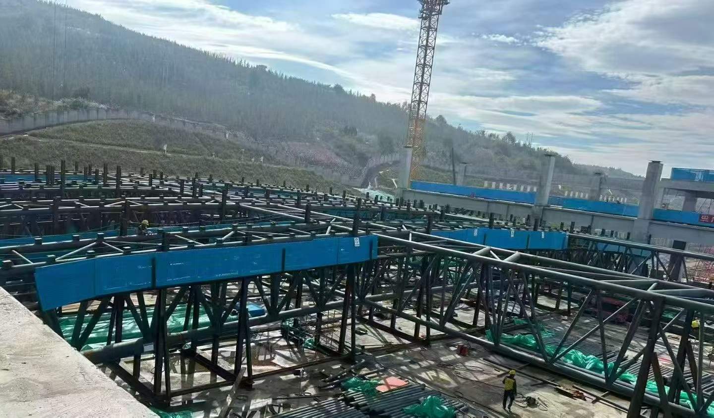 昭通東站屋面桁架采用主次立體桁架結構,屋面桁架寬度為171m(側式站房),114m(高架站房),總長度為143.95m,桁架頂標高為29.7m,鋼結構重量2400t,跨度達63m,最大懸挑長度16.5m,焊縫長度23000m。A軸及兩側主體結構柱、A軸外側W型桁架柱,屋蓋在周圈及支座位置布置水平支撐增加結構整體穩定性,屋蓋與下部主體結構連接采用成品抗震球鉸支座。屋蓋圍護結構為鋼檁條支撐金屬屋面。總重量2400t,最大跨度63m。