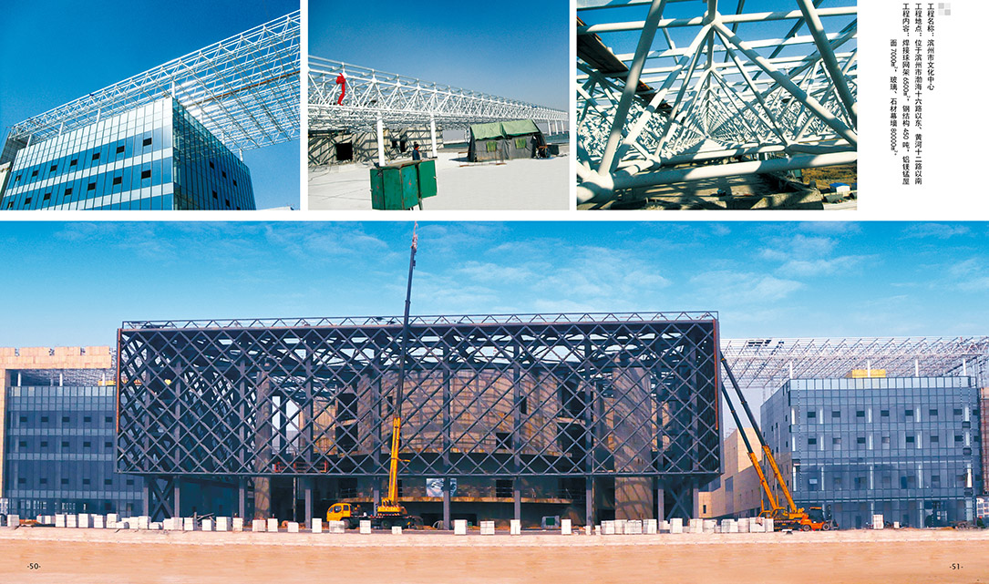 焊接球網架6500m2,鋼結構450噸,鋁鎂錳屋面7000m2,玻璃、石材幕墻80000m2。