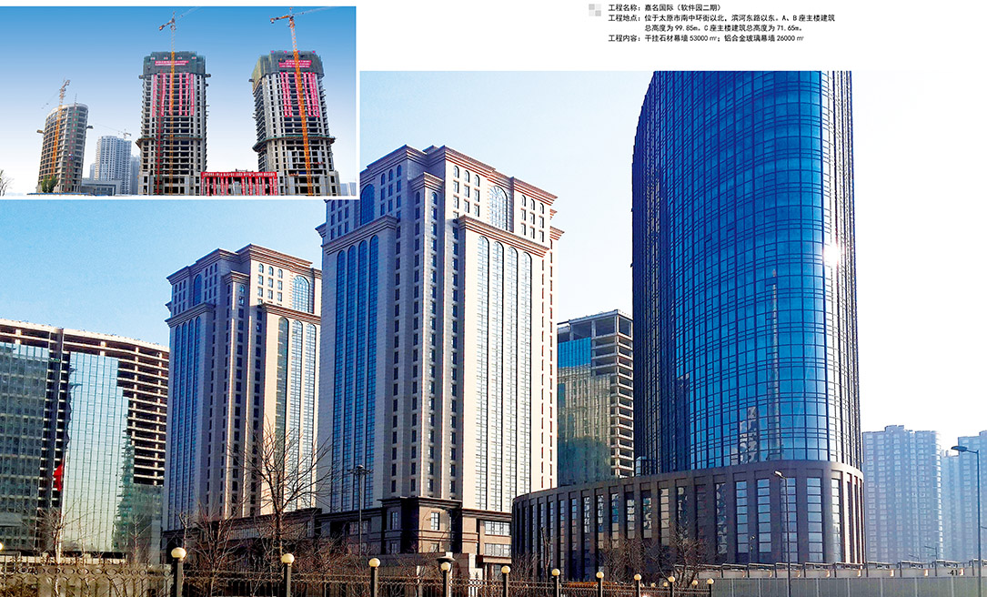 干掛石材幕墻53000m2,鋁合金玻璃幕墻26000m2。