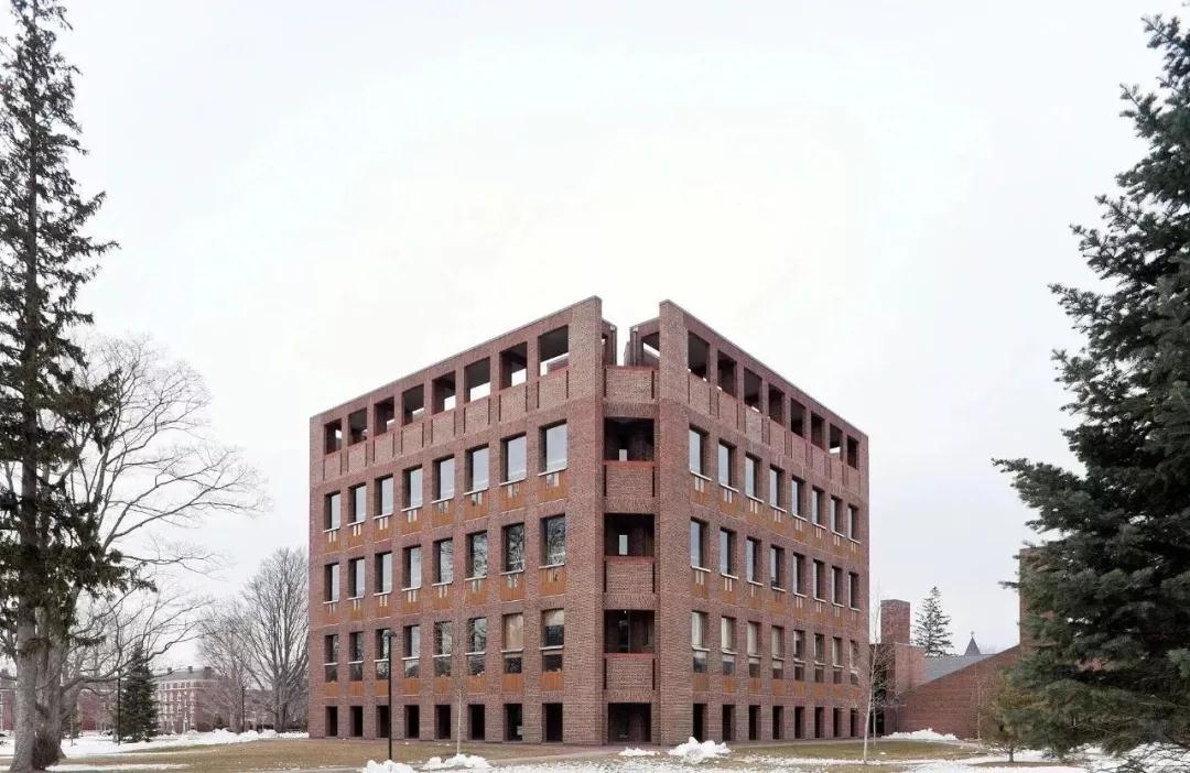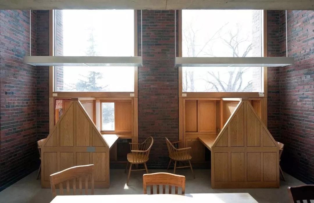 作為路易斯康的經典之作,表達了極強的幾何感,對稱感,呈現出一種理性的美。外表方正、內部分隔出閱覽、藏書、中庭三層結構。中庭的墻面上挖了4個巨型圓洞,人與巨型圓洞在尺度上形成鮮明對比,顯示出人的渺小。閱覽區的三角形獨立座位,劃分出靜謐的私人空間。方形、圓形、三角形在這部作品里的運用,營造出一種靜態的空間氛圍,非常符合圖書館空間的設計需求。
