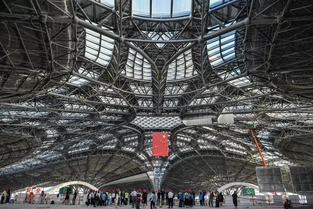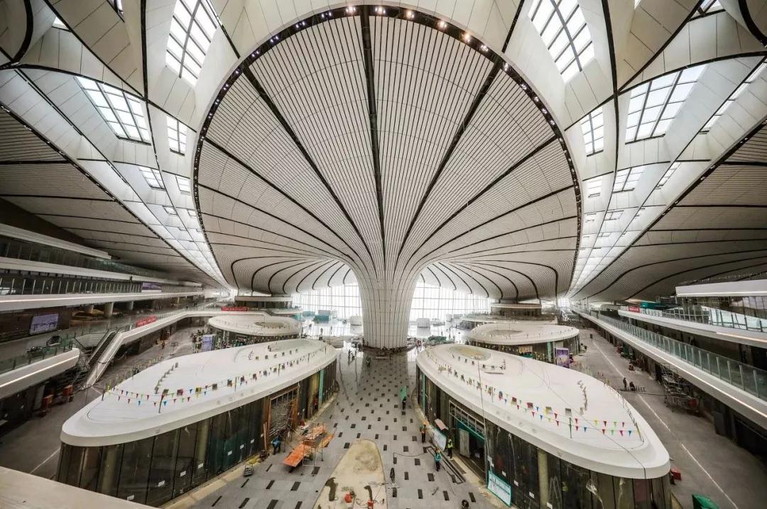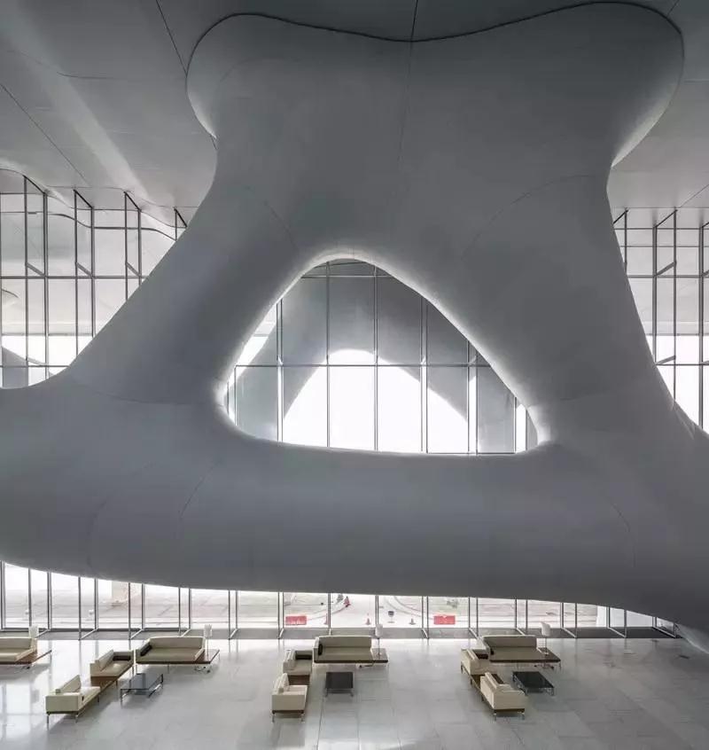 以扎哈的北京大興國際機場為例。如果我們從空中鳥瞰大興機場的棚頂結構,會覺得有點兒酷似六芒星的結構。但是,如果我們對它的曲面進行劃分,可以發現,這座建筑也是由“葉狀結構”所形成的。實際上看它內部的鋼架結構,里面由兩簇彼此垂直的曲線結構組成,結構中間存在一個穩定的奇異點。