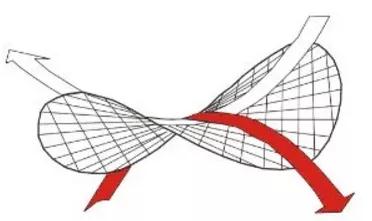 雙曲拋物面是羅氏幾何的一個重要模型。每個面上都有兩條拋物線,形成的結構既能抗壓也能抗拉。又因形狀酷似馬鞍,也被稱作“馬鞍面”。它的重要特征——直紋曲面,即它可看成由兩族直線構成。這個特點為后期施工帶來極大的便利性。(我們常吃的某些薯片就是馬鞍面哦)