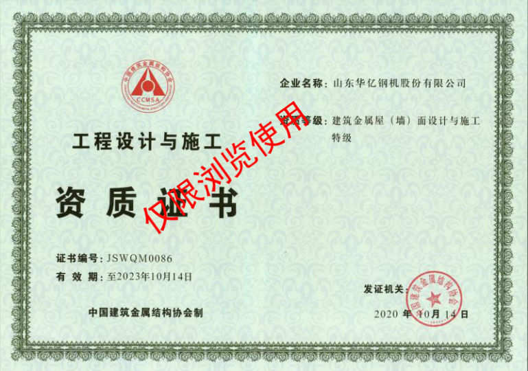 我公司自成立以來,以為社會和客戶創造價值為己任,勇于創新,不斷進取,勇攀行業高峰。近日成功通過中國建筑金屬結構協會及分會幾位鋼結構專家的嚴謹評審,建筑金屬屋(墻)面設計與施工特級資質證書已順利頒發!