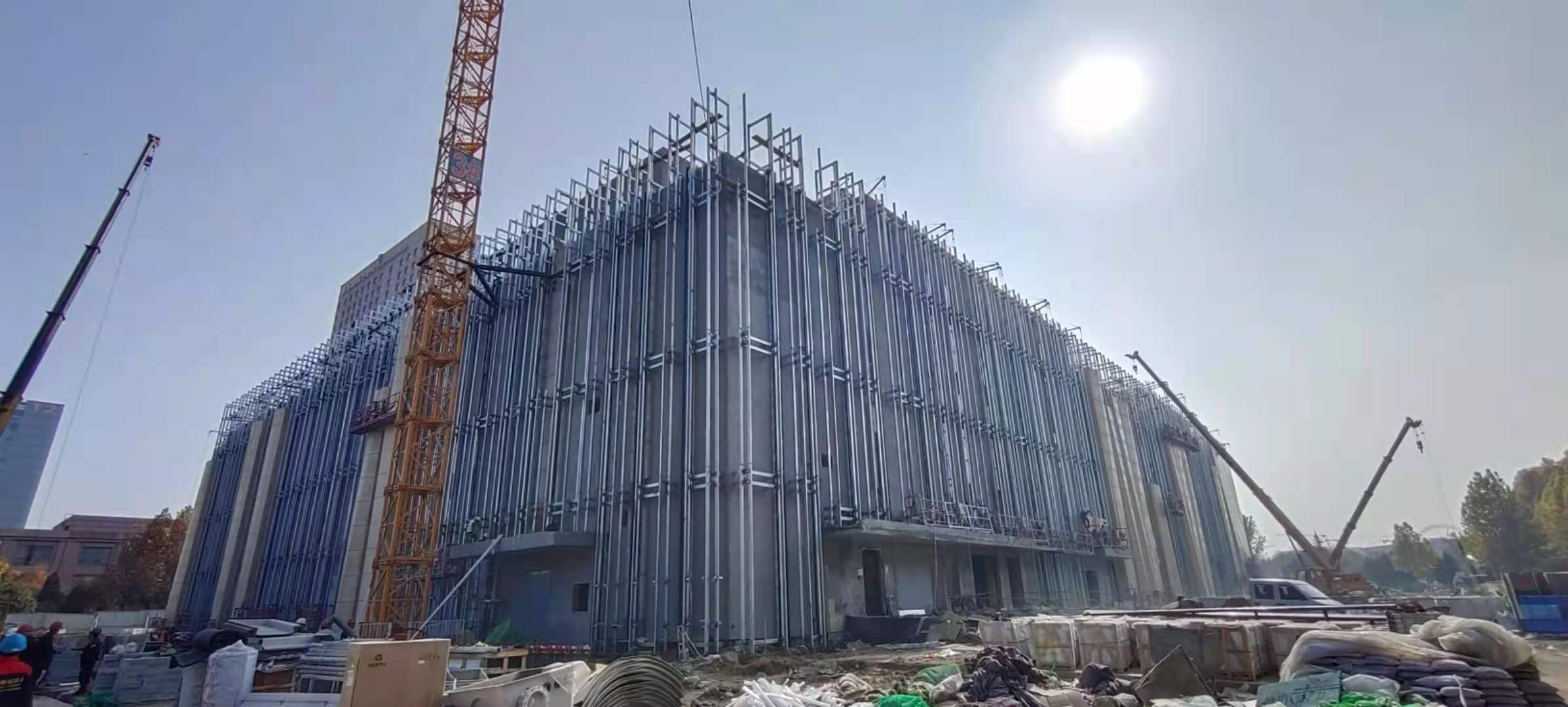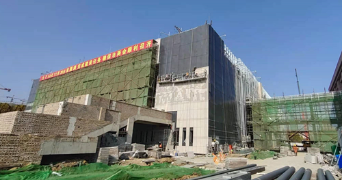 日前,我公司承接的位于濟(jì)寧高新區(qū)崇文大道北側(cè)的海達(dá)會展中心項目幕墻工程龍骨全部完成,藝術(shù)板及石材浮雕板正在安裝,項目進(jìn)展有條不紊,井然有序。