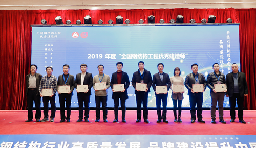 會議對“2019年度建筑鋼結構行業科技創新優秀企業和杰出人才”、“2019年度全國鋼結構工程優秀建造師”等先進單位或個人進行了表彰,張猛董事長作為頒獎嘉賓為“2019年度全國鋼結構工程優秀建造師”頒獎并祝賀!