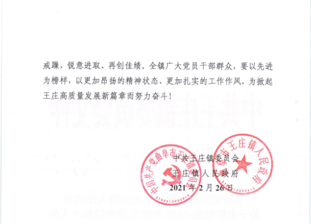 3月14日,曲阜市王莊鎮(zhèn)總結(jié)表彰暨重點工作攻堅動員大會召開。鎮(zhèn)黨委書記王洪生出席會議并講話,黨委副書記、鎮(zhèn)長李萌主持會議。企事業(yè)單位負責人等參加會議。我公司副總經(jīng)理楊鴻等受表彰的代表參加會議。
