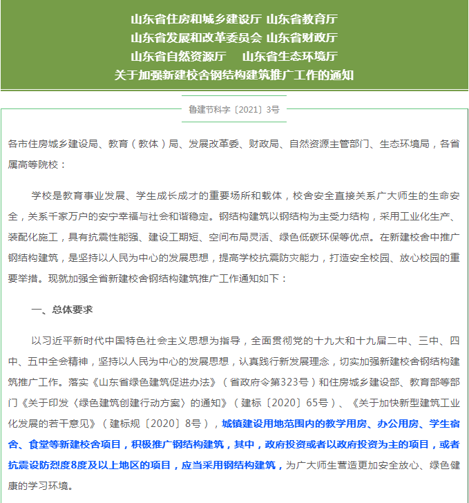山東省住建廳等六部門關(guān)于加強(qiáng)新建校舍鋼結(jié)構(gòu)建筑推廣工作的通知