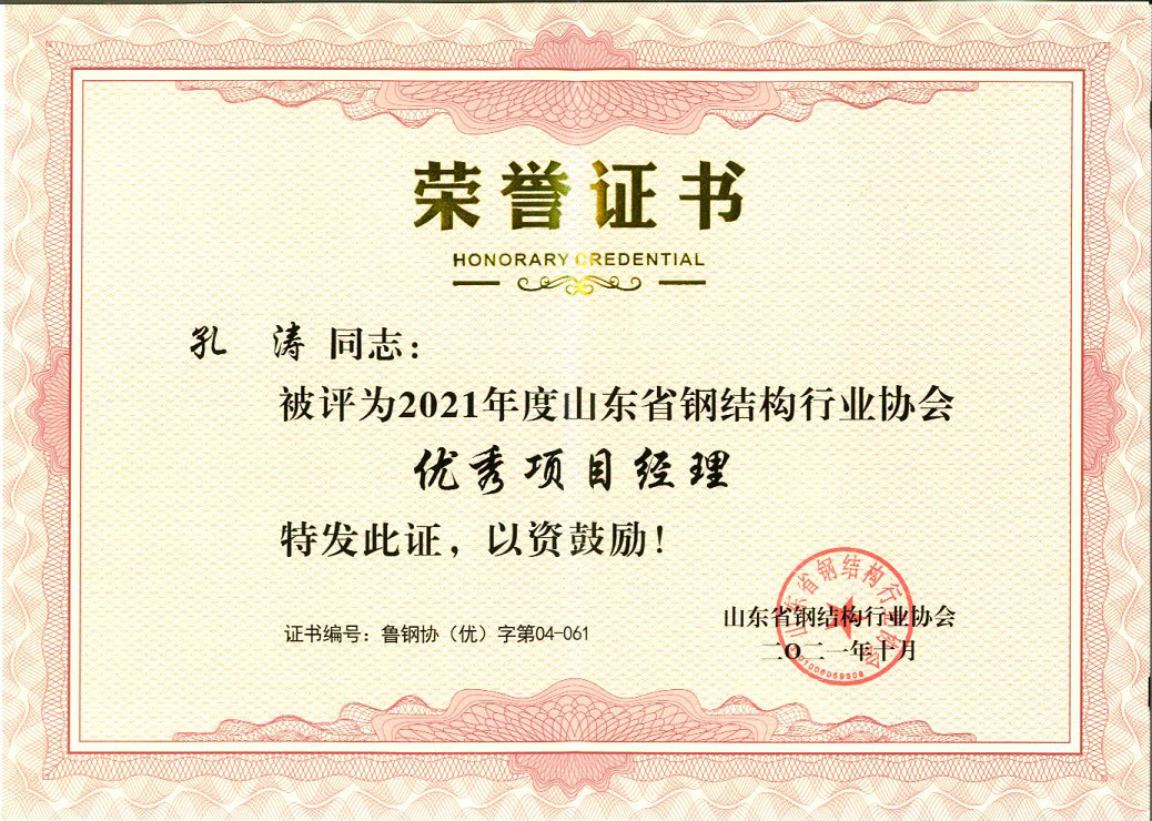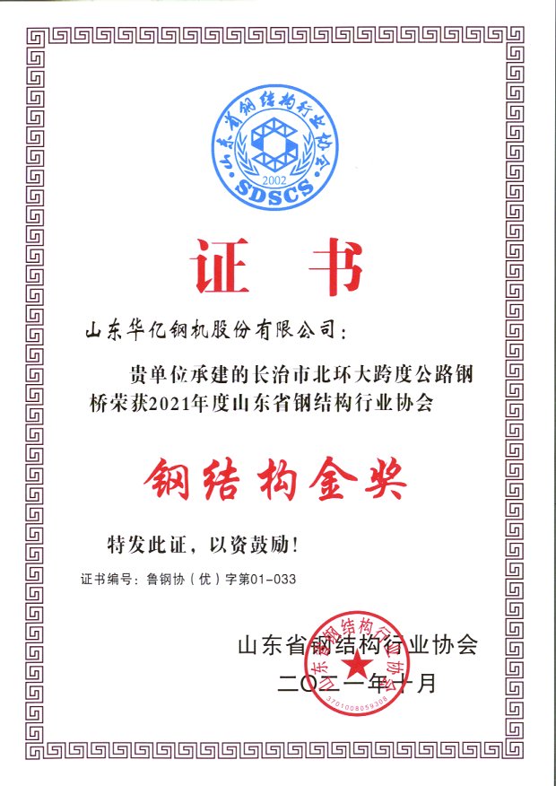 榮譽(yù)見證實力,百煉方能成鋼。公司承建的長治市北環(huán)大跨度公路鋼橋和菏澤機(jī)場非民航項目鋼結(jié)構(gòu)工程兩個項目榮獲“山東省鋼結(jié)構(gòu)金獎”榮譽(yù)稱號,同時,孔濤、李國棟、欒輝也分別被授予“優(yōu)秀項目經(jīng)理”榮譽(yù)稱號。
