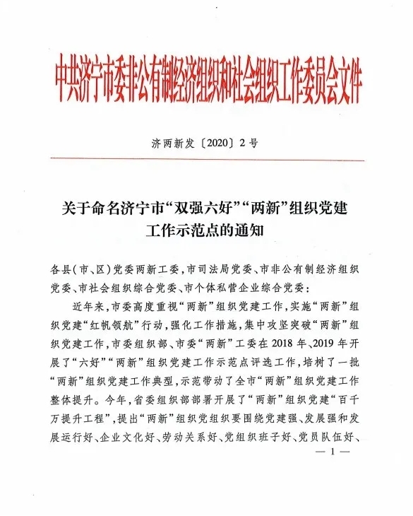 “雙強六好”是在非公有制經(jīng)濟組織和社會組織范圍中開展的一項評選活動。“雙強六好”即:發(fā)展強、黨建強和生產(chǎn)經(jīng)營好、企業(yè)文化好、勞動關(guān)系好、黨組織班子好、黨員隊伍好、社會評價好。評選旨在培樹先進典型,示范帶動濟寧市“兩新”組織黨建工作整體提升。