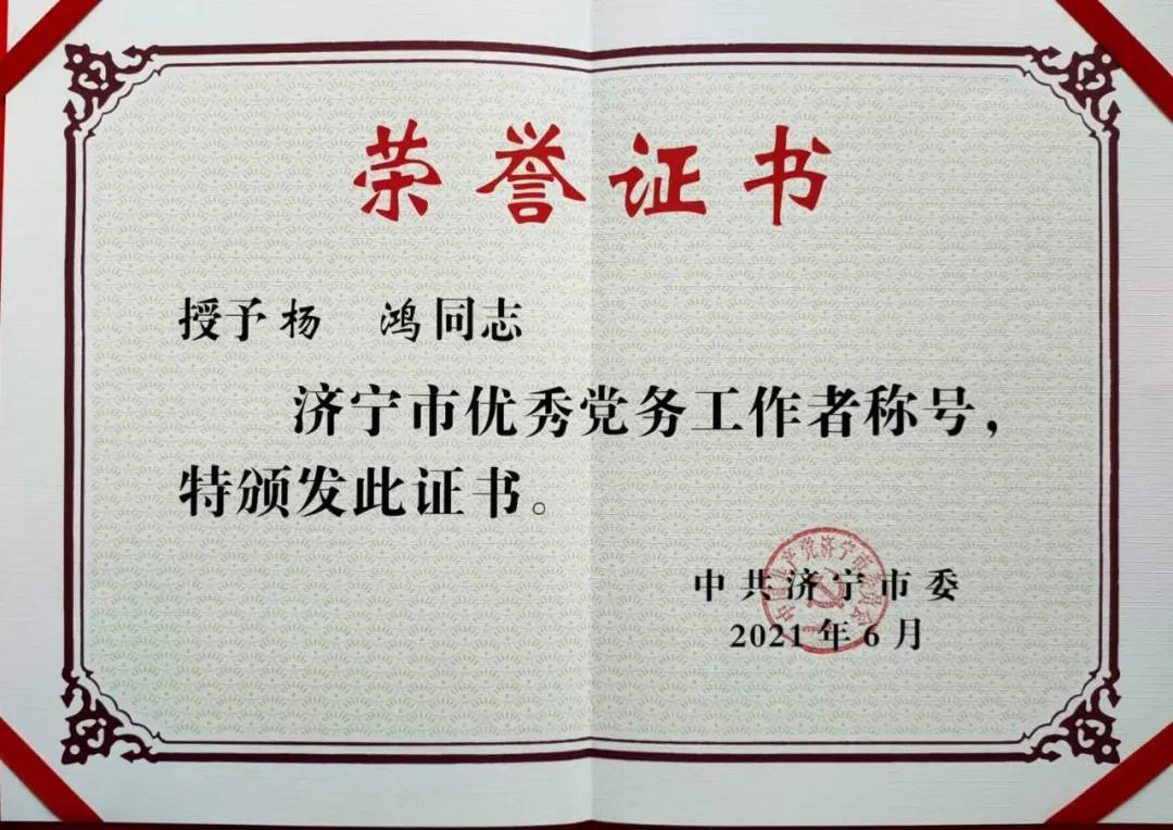 6月30日上午,濟寧市優秀共產黨員、優秀黨務工作者和先進基層黨組織表彰大會在我公司承包施工幕墻項目的濟寧市圣都會議中心召開,公司黨支部書記楊鴻同志獲“濟寧市優秀黨務工作者”榮譽稱號,這是繼黨支部書記楊鴻同志榮獲曲阜市“紅帆能手”和被濟寧市委組織部授予“雙強六好”“兩新”組織示范點之后,公司在黨支部建設方面取得的又一項市級榮譽。