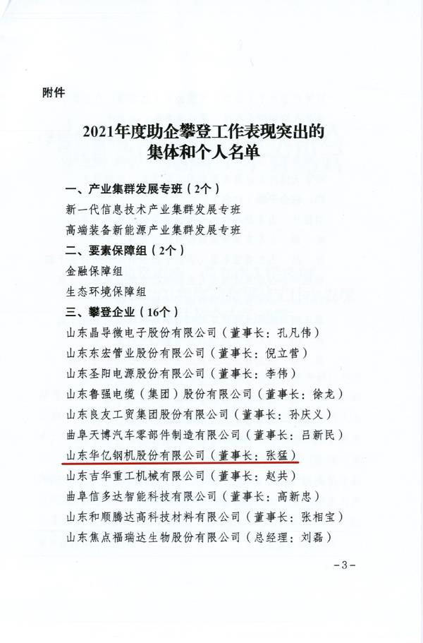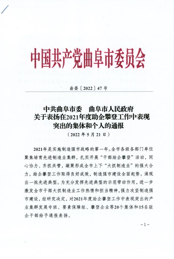 5月22日,曲阜市助企攀登工作會(huì)議召開(kāi),會(huì)議對(duì)助企攀登工作進(jìn)行階段性總結(jié),并對(duì)2021年度表現(xiàn)突出的集體和個(gè)人進(jìn)行了通報(bào)表?yè)P(yáng),公司榮獲全市助企攀登突出集體。
