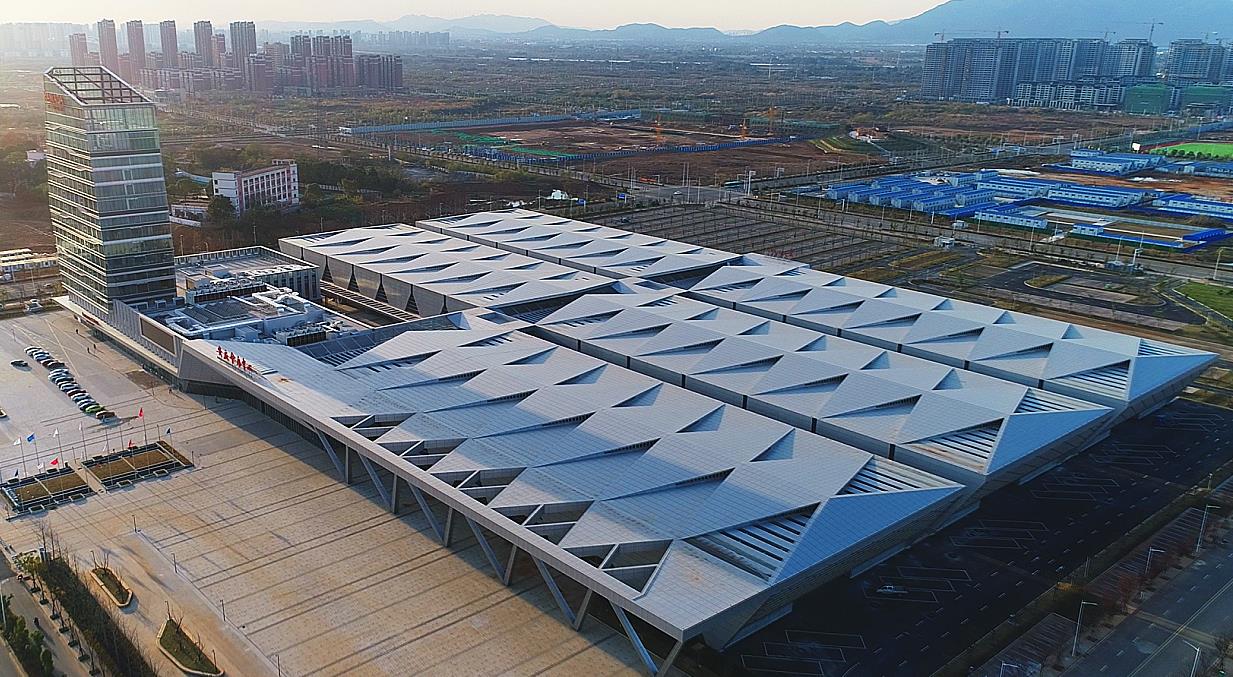 安慶會展中心建設總規模10.15萬平方米左右,項目總投資13.5億元。展覽館由5個展廳及南北縱橫的共享大廳組成,總建筑面積約4.2萬平方米,每個展廳凈展面積約5600平方米,建筑高度18米、長108米、寬54米。上部結構均為鋼框架+屈曲約束支撐+張弦桁架,屋面采用鋁鎂錳板金屬屋面。