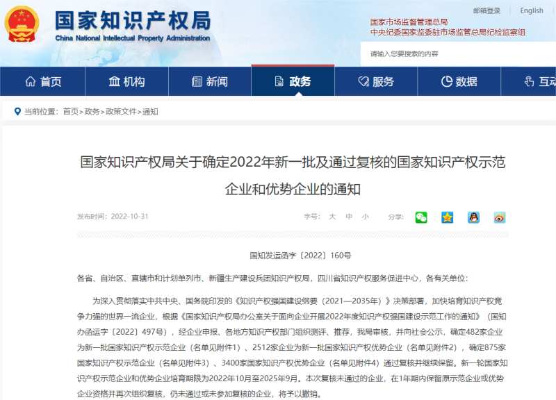 近日,國家知識產權局發布國家知識產權示范企業和優勢企業評定結果,我公司憑借在知識產權創造、運用、管理及保護等方面的多重優勢,榮獲“2022年國家知識產權優勢企業”。成為國家打造知識產權強企建設第一方陣的重要一員。