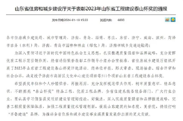 “泰山杯”是我省工程建設領域最高質量獎項,主要突出建筑業(yè)發(fā)展、工程質量等10大行業(yè)領域,獲獎工程質量代表了山東省工程質量的最高水平,此次獲獎是對公司項目建設工作的充分認可。