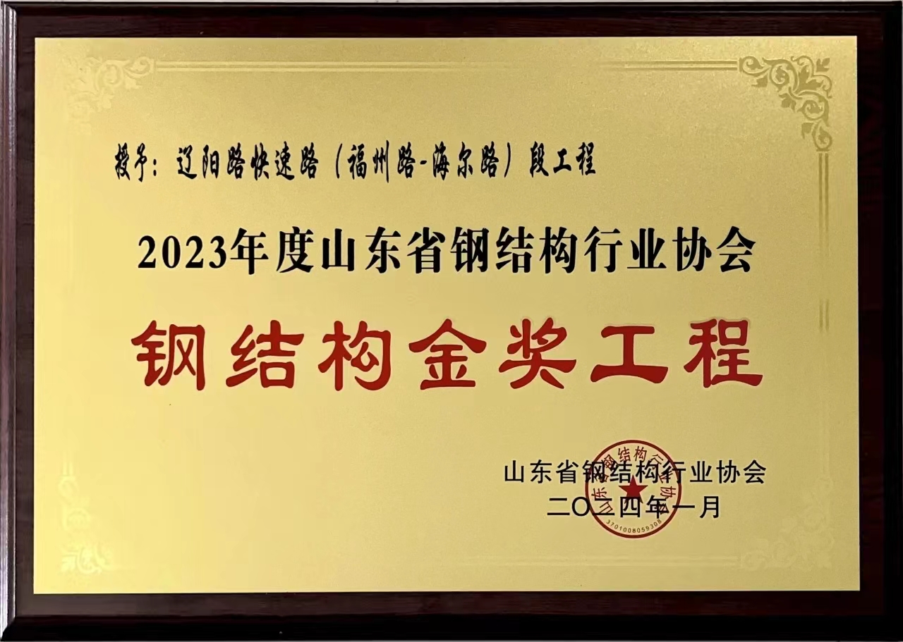 由公司承建的遼陽路快速路(福州路—海爾路)段工程(施工)榮獲2023年度山東省鋼結構行業協會鋼結構金獎、孔令帥榮獲突出貢獻項目經理,公司榮獲2023年度山東省鋼結構行業協會科技創新優秀企業,公司副總經理李平榮獲2023年度山東省鋼結構行業協會(制造類)優秀工匠,“大噸位液壓同步提升安裝工法”入選2023年度山東省鋼結構行業協會工程建設工法名單,公司技術部QC小組榮獲2023年度山東省鋼結構行業協會QC活動優秀成功二等獎,公司鋼構工程焊接變形質量控制QC小組榮獲2023年度山東省鋼結構行業協會QC活動優秀成果三等獎。