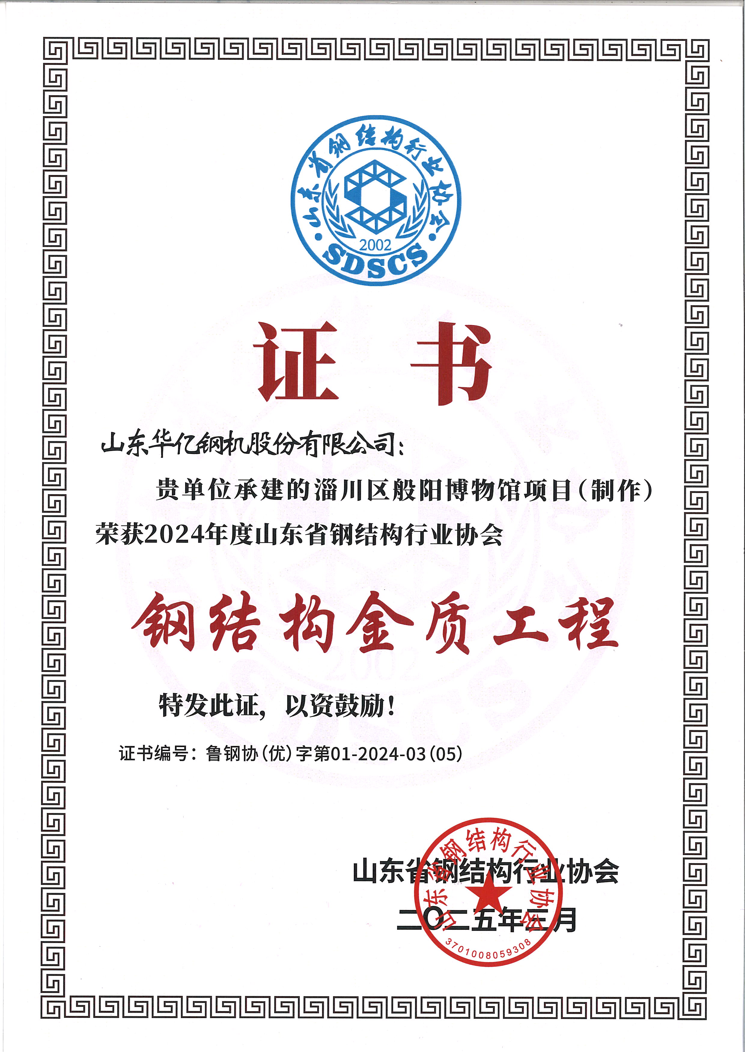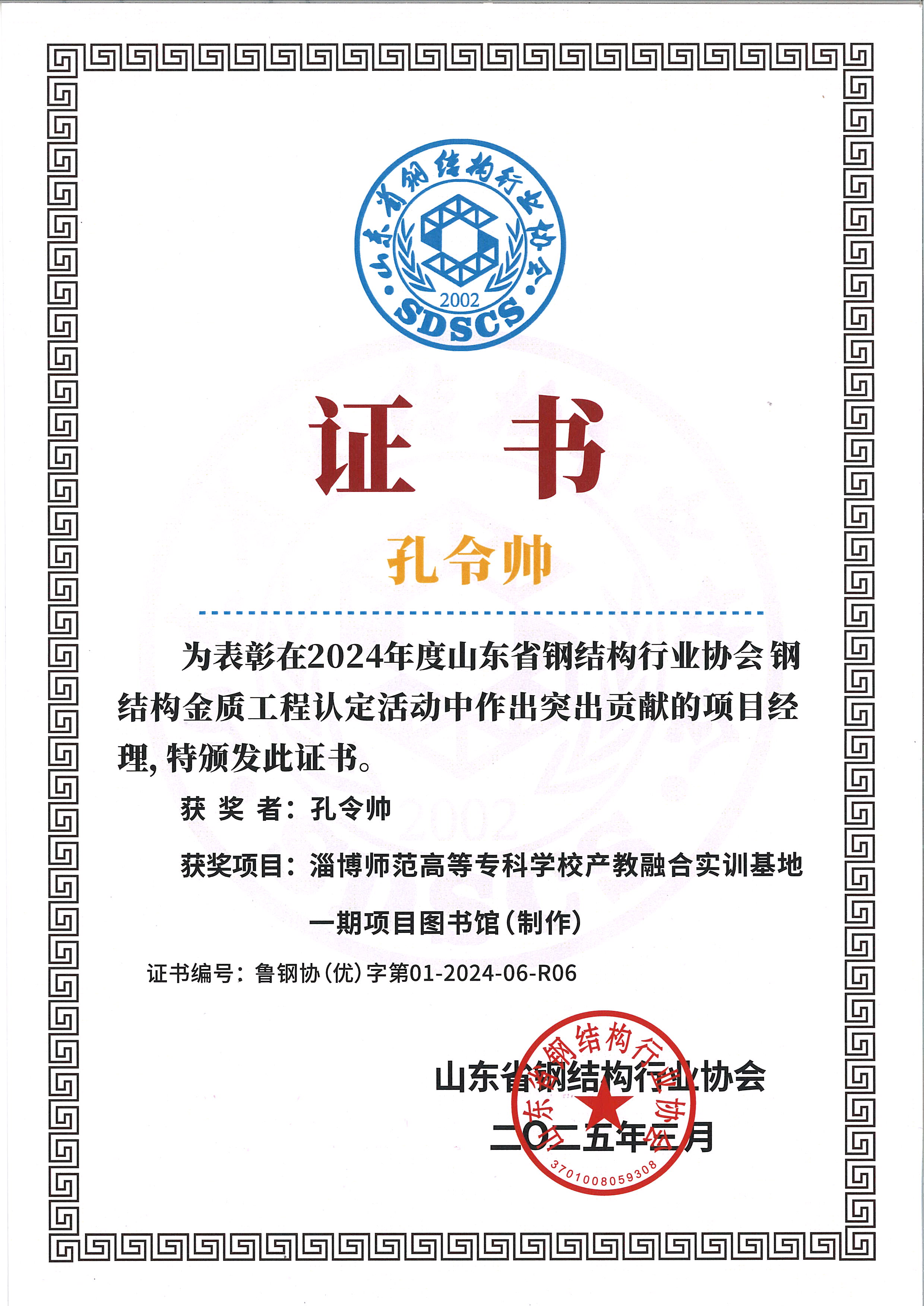 公司參建的淄川區(qū)般陽(yáng)博物館項(xiàng)目、淄博師范高等專科學(xué)校產(chǎn)教融合實(shí)訓(xùn)基地一期項(xiàng)目圖書館榮獲山東省鋼結(jié)構(gòu)行業(yè)協(xié)會(huì)鋼結(jié)構(gòu)金質(zhì)工程獎(jiǎng);孔令帥、孔明榮獲突出貢獻(xiàn)項(xiàng)目經(jīng)理。
