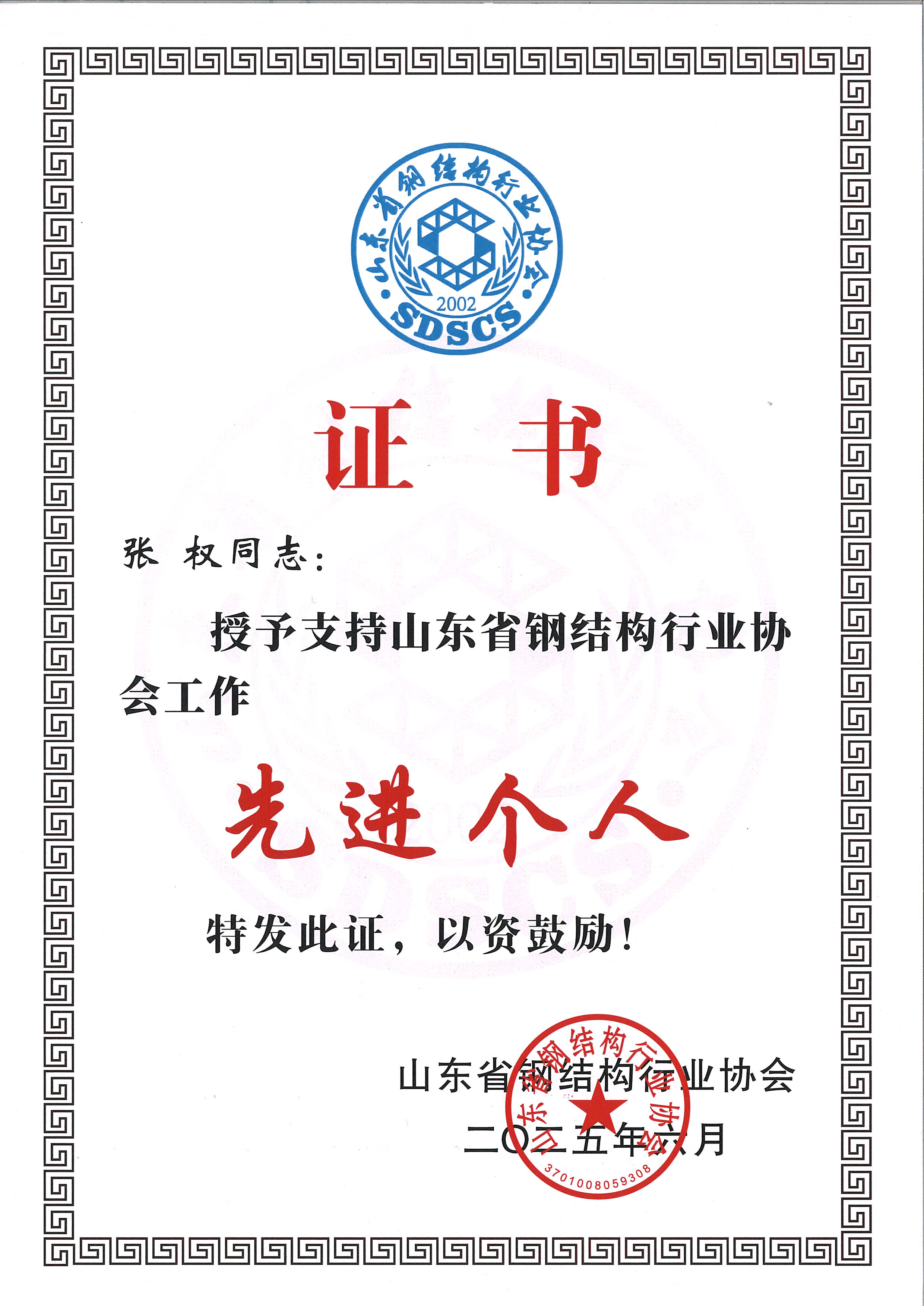 公司榮獲支持山東省鋼結(jié)構(gòu)行業(yè)協(xié)會(huì)工作先進(jìn)單位,總經(jīng)理張權(quán)榮獲支持山東省鋼結(jié)構(gòu)行業(yè)協(xié)會(huì)工作先進(jìn)個(gè)人