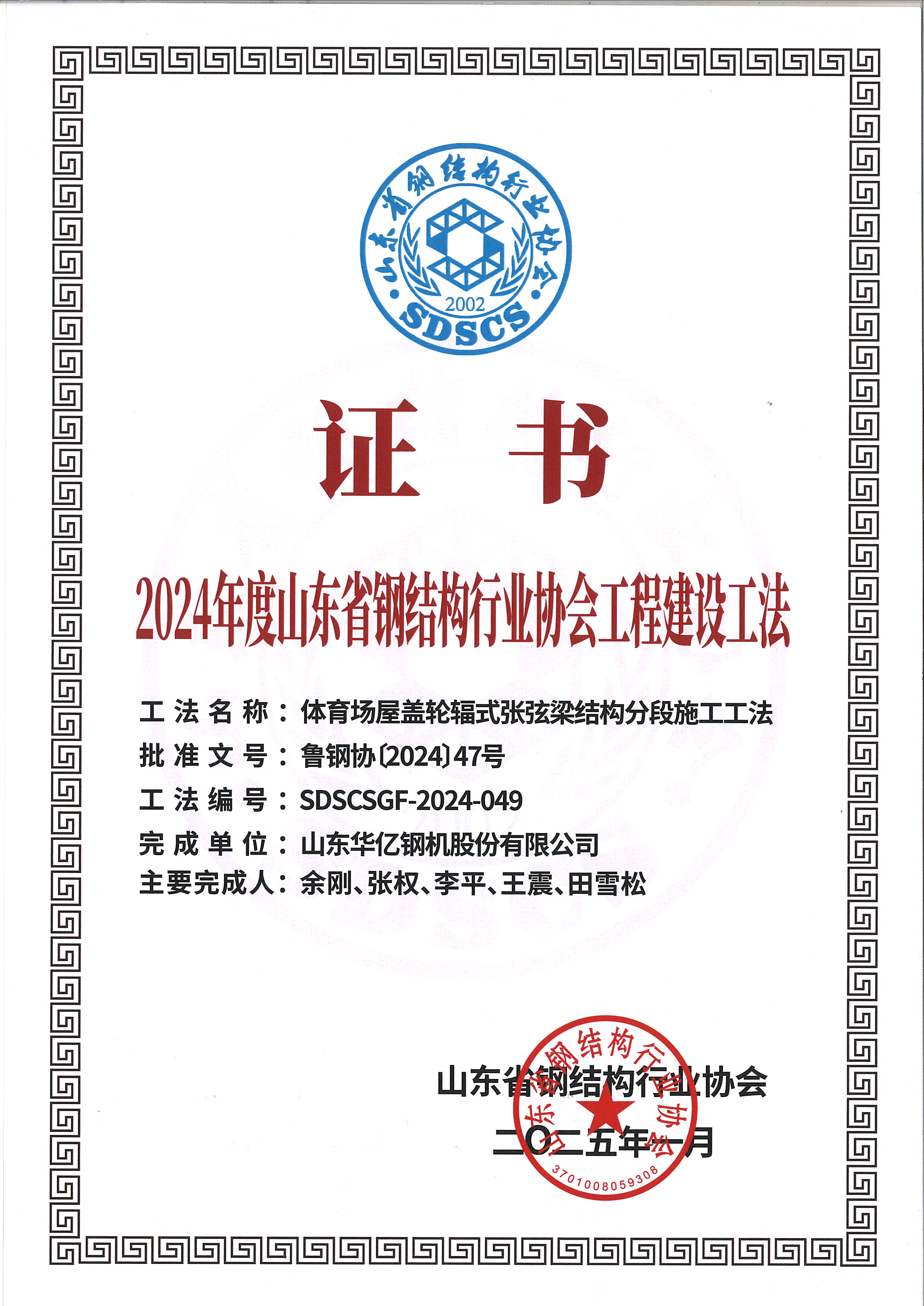 公司“幸福新城焊接質(zhì)量”QC小組榮獲2024年度山東省鋼結(jié)構(gòu)行業(yè)協(xié)會(huì)QC優(yōu)秀成果一等獎(jiǎng),“體育場(chǎng)屋蓋輪輻式張弦梁結(jié)構(gòu)分段施工工法”入選2024年度山東省鋼結(jié)構(gòu)行業(yè)協(xié)會(huì)工程建設(shè)工法