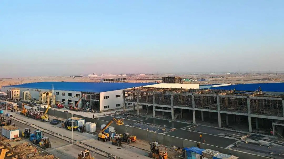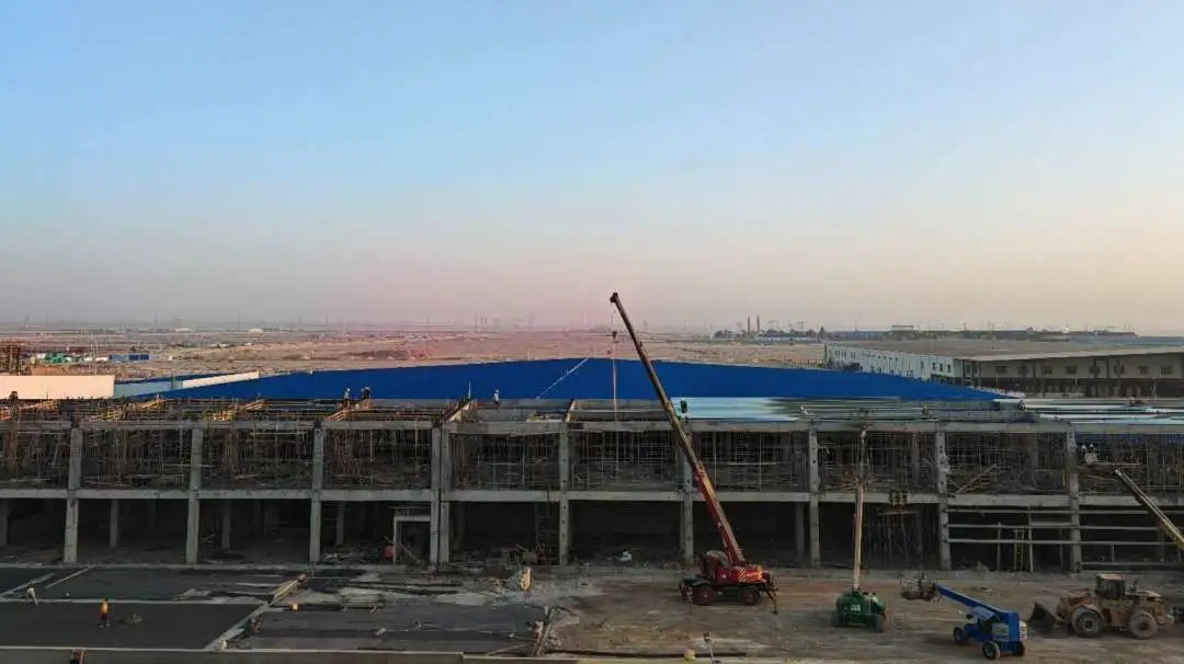 項目位于埃及蘇伊士灣西北經濟特區,以高標準廠房建設為核心,涵蓋辦公樓、工業廠房及配套設施,主體鋼結構采用單層門式剛架結構,是埃及新能源基礎設施建設的重點工程,其竣工投用將為當地工業發展注入新動能。
