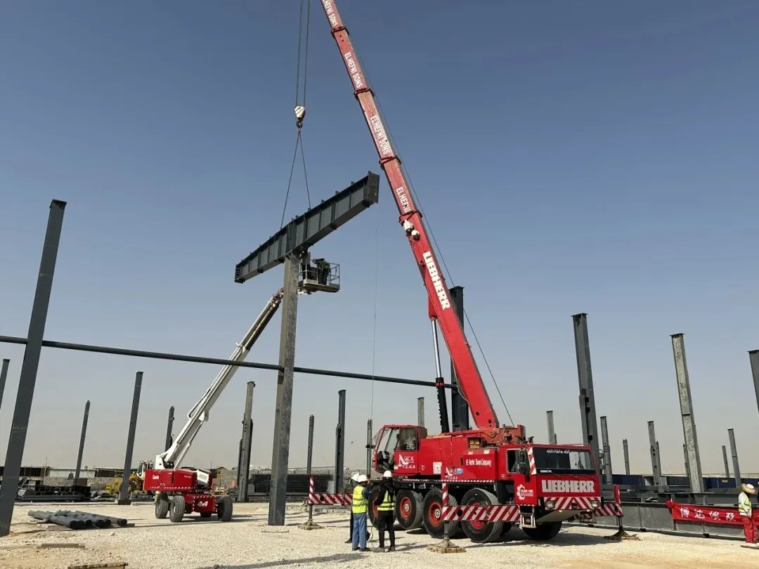自開工以來,公司項目團隊直面埃及當地高溫、強風沙的極端自然環境對鋼結構安裝精度與施工安全提出的嚴峻挑戰,科學組織施工,積極推進項目建設進度,通過周密的前期策劃、動態的施工調整和高效的跨文化溝通,不僅保障了工程安全與進度,更實現了質量、成本與工期的全面受控,為項目最終成功交付奠定了堅實基礎。