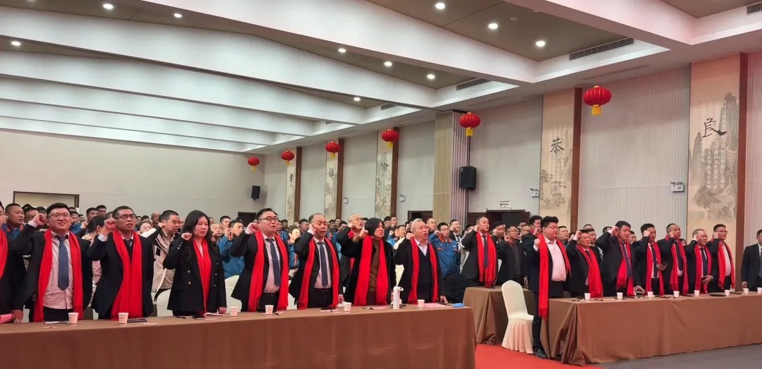 年會伊始,全體與會員工肅然起立,高舉右拳,莊嚴進行企業文化宣誓。鏗鏘有力的誓言響徹會場,字字句句傳遞著公司對“造優質產品 筑精品工程”企業使命的堅守,彰顯了全體員工昂揚向上的精神風貌。