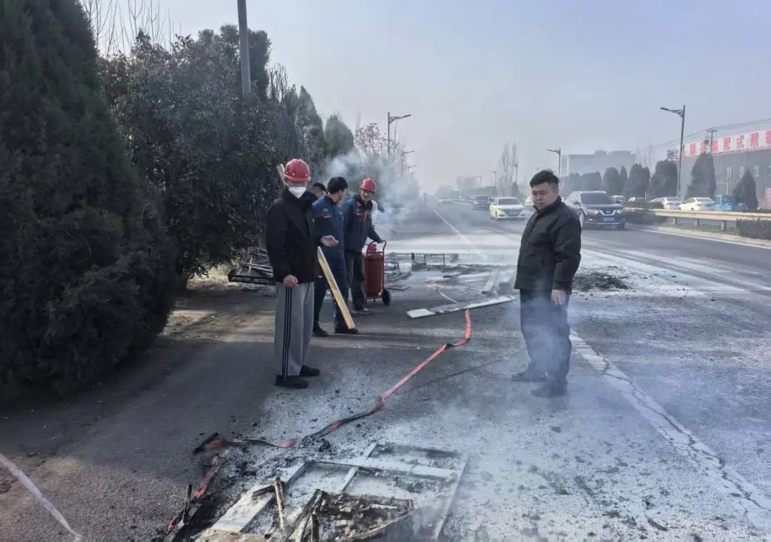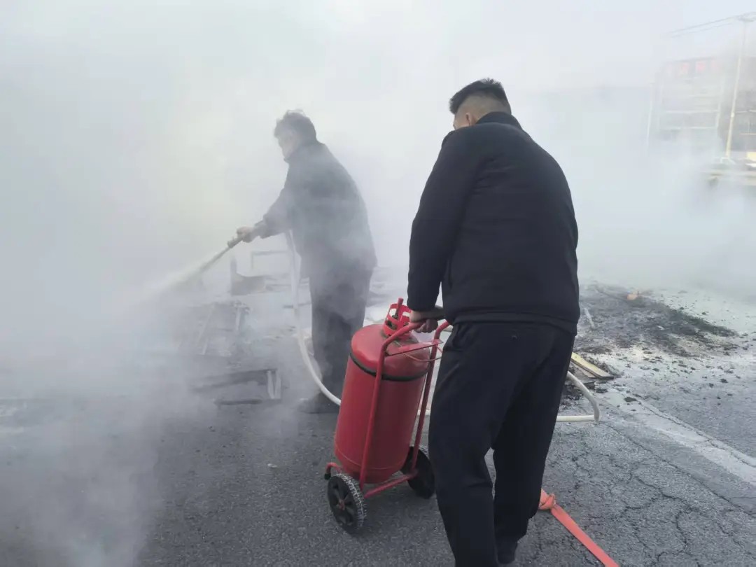 發現火情后,湯昊森同志第一時間啟動應急處置流程,緊急集結身邊員工,攜帶公司滅火器等消防器材沖向火災現場。面對灼熱火焰與嗆人濃煙,救援隊伍毫無畏懼,在湯昊森的科學指揮下分工協作、緊密配合,經過緊張高效的處置,眾人成功將明火徹底撲滅,有效避免了火勢向周邊廠房、道路蔓延。