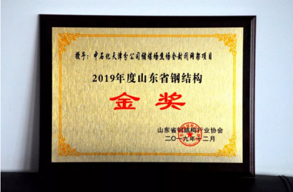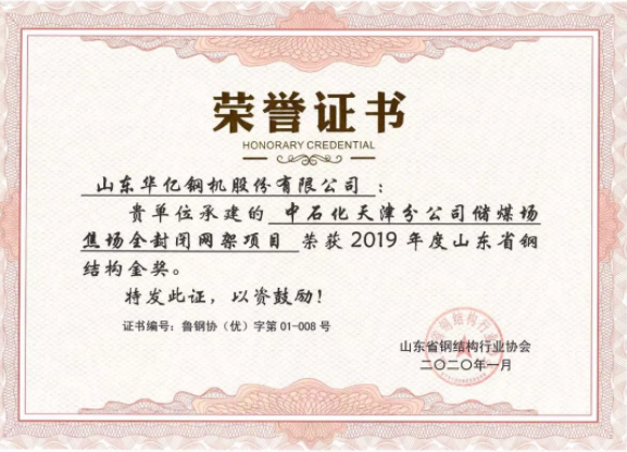 華億鋼機獲得中石化天津分公司儲煤場焦場全封閉網架項目-山東鋼結構金獎。
