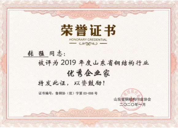 張猛董事長榮獲2019年度山東省鋼結構行業優秀企業家。
